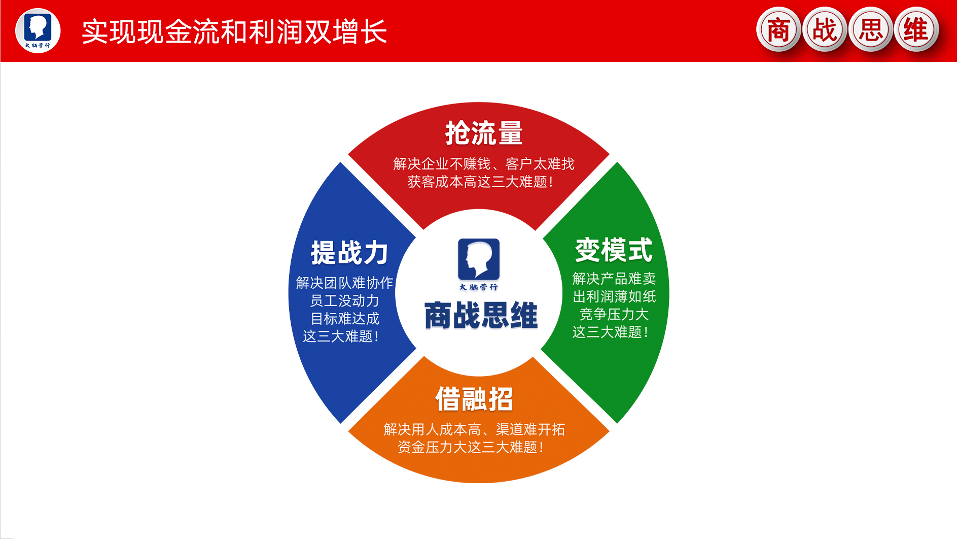 《商战思维》旨在帮助老板解决经营管理中四大难题, 1、解决客户不好找 2、产品不好卖 3、现金流匮乏 4、团队无战力 |